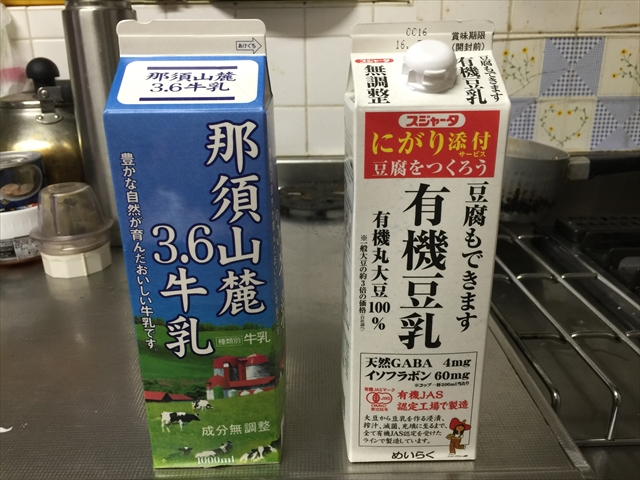 牛乳、豆乳を冷蔵庫から出して常温に戻します。