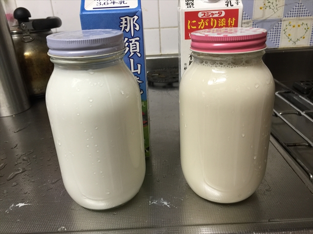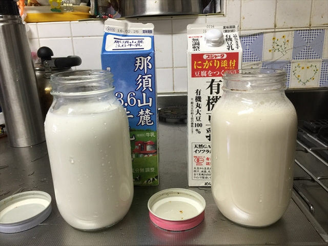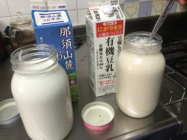 瓶に牛乳、豆乳を入れます。
