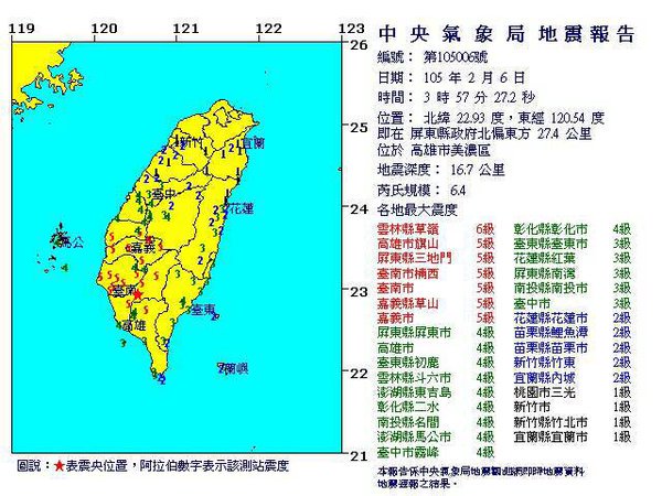 6日午前3時57分ごろ(日本時間の午前4時57分ごろ)、台湾南部の高雄市を震源とする地震がありました。